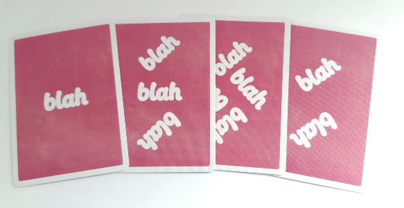 Player 1 plays a card with blah blah blah (3 blahs). Now player 2 must discard up to three cards one at a time. The first card is nonsense, the second is a single blah. The chase passes to the next player. Player 3 discards a nonsense card and so does not cover the chase. Player 2 wins the discard pile and adds these cards to the bottom of their hand.